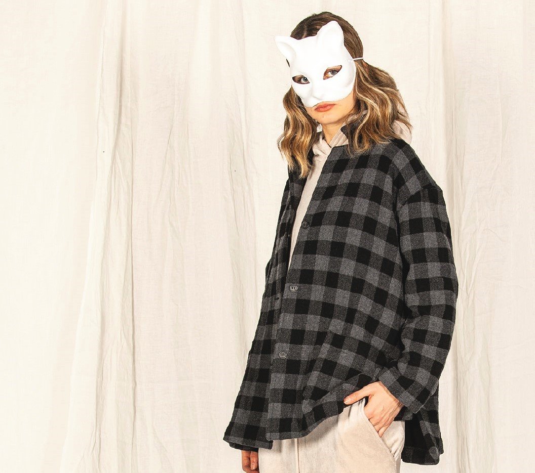 Una giacca oversize di MAMA B Autunno/Inverno '24 con motivo a quadri neri e grigi. Forma morbida squadrata. Presenta bottoni per allacciarsi sul davanti, due tasche frontali e piccoli spacchi laterali. COLORE: NERO COMPOSIZIONE: 80% WO, 20% PA