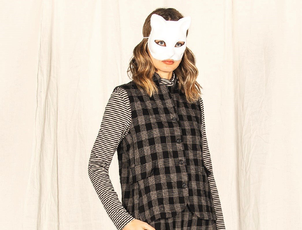 Gilet con due tasche sul davanti e collo tondo. Realizzato con un nuovo tessuto a quadri neri. Perfetto da abbinare alla gonna PESCI dello stesso tessuto per un look fuori dal tempo. Composizione: 99%CO, 1%EA